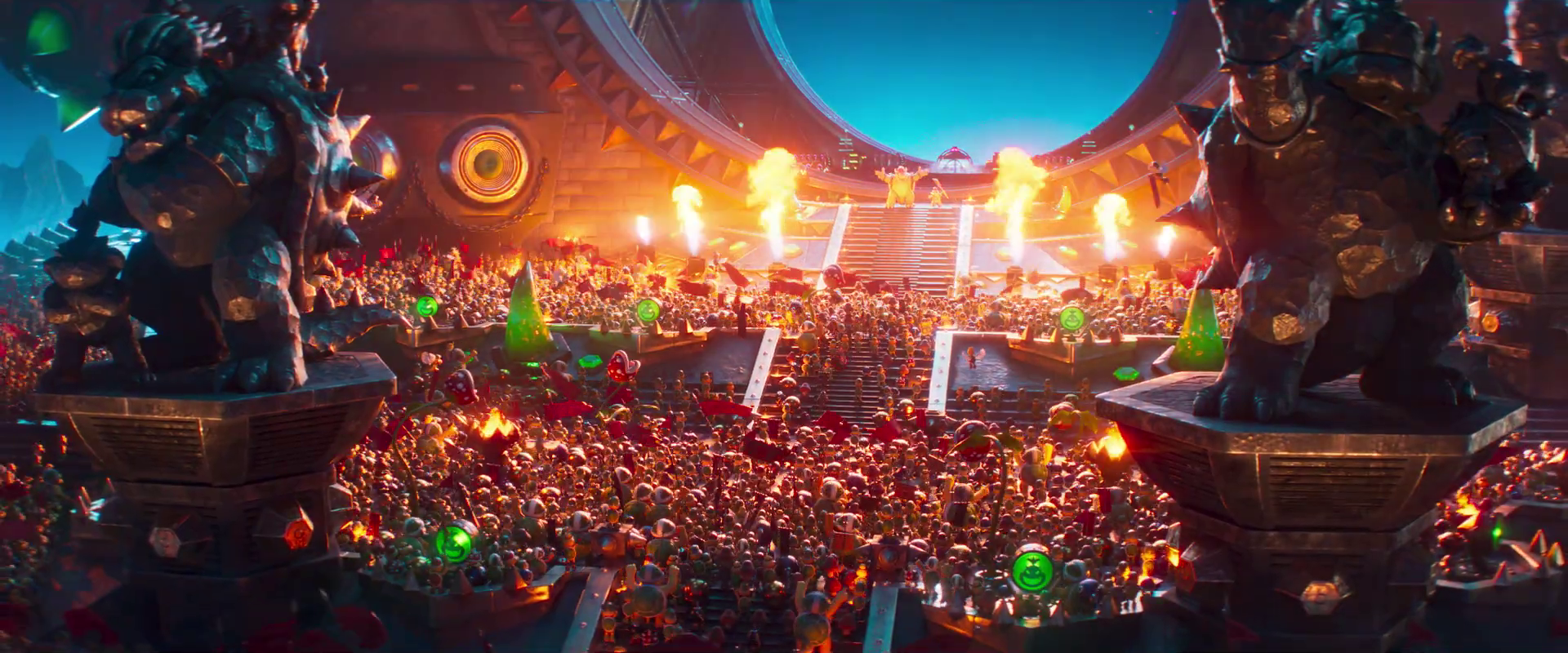The Koopa King is treated to a hero's (villain's?) welcome with a show fit for a rock star! Huge and awesome-looking statues of Bowser and Bowser Jr. can be seen on top of pedestals. One thing I love so much about these movies is the suggestion that Bowser's troops absolutely adore him! Sure, they are probably fearful of their massive and powerful king, but they also command genuine respect to him. He fills them with inspiration and leadership.