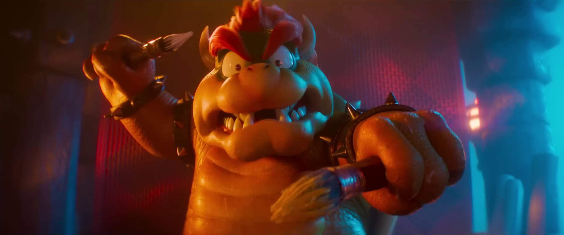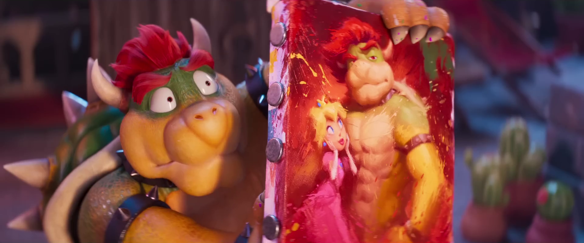 I nearly dropped my aforementioned iPhone laughing at this! Bowser painted himself as a ripped GigaChad while Peach stares up at him with awe as if he's some sort of sculpted Greek God! Bowser appears super excited behind the painting grinning while he awaits approval! Luigi enthusiastically says "love the colors!" while a frowning Mario leans in and carefully mentions "it's trash..." Bowser looks hilariously dejected for a split second, and then rages and destroys his masterpiece on the spot! These movies have had great comedy to them, and this one will no doubt be very entertaining!