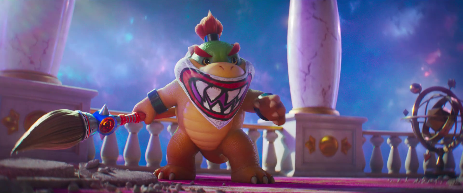On the voice front, he definitely has a more adolescent-sounding voice that some don't think fits the small form of his appearance; but I think Benny Safdie found a voice for him that gives enough brattiness to work! Let's be honest here: would we be able to handle Bowser Jr.'s more kid-sounding game voice throughout a full 90-minute movie? Maybe. It's also possible we are just used to him sounding a certain way since he was introduced in Super Mario Sunshine and in Mario Kart and all the other games we've heard him in.
