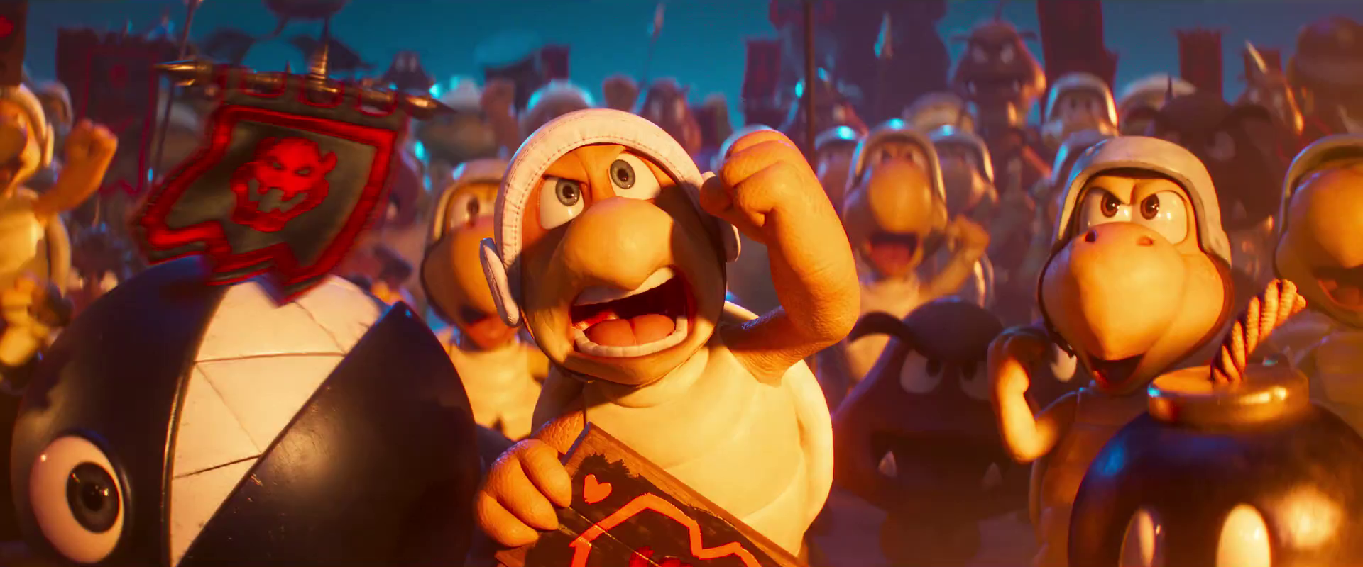 The Koopa King is treated to a hero's (villain's?) welcome with a show fit for a rock star! Huge and awesome-looking statues of Bowser and Bowser Jr. can be seen on top of pedestals. One thing I love so much about these movies is the suggestion that Bowser's troops absolutely adore him! Sure, they are probably fearful of their massive and powerful king, but they also command genuine respect to him. He fills them with inspiration and leadership.